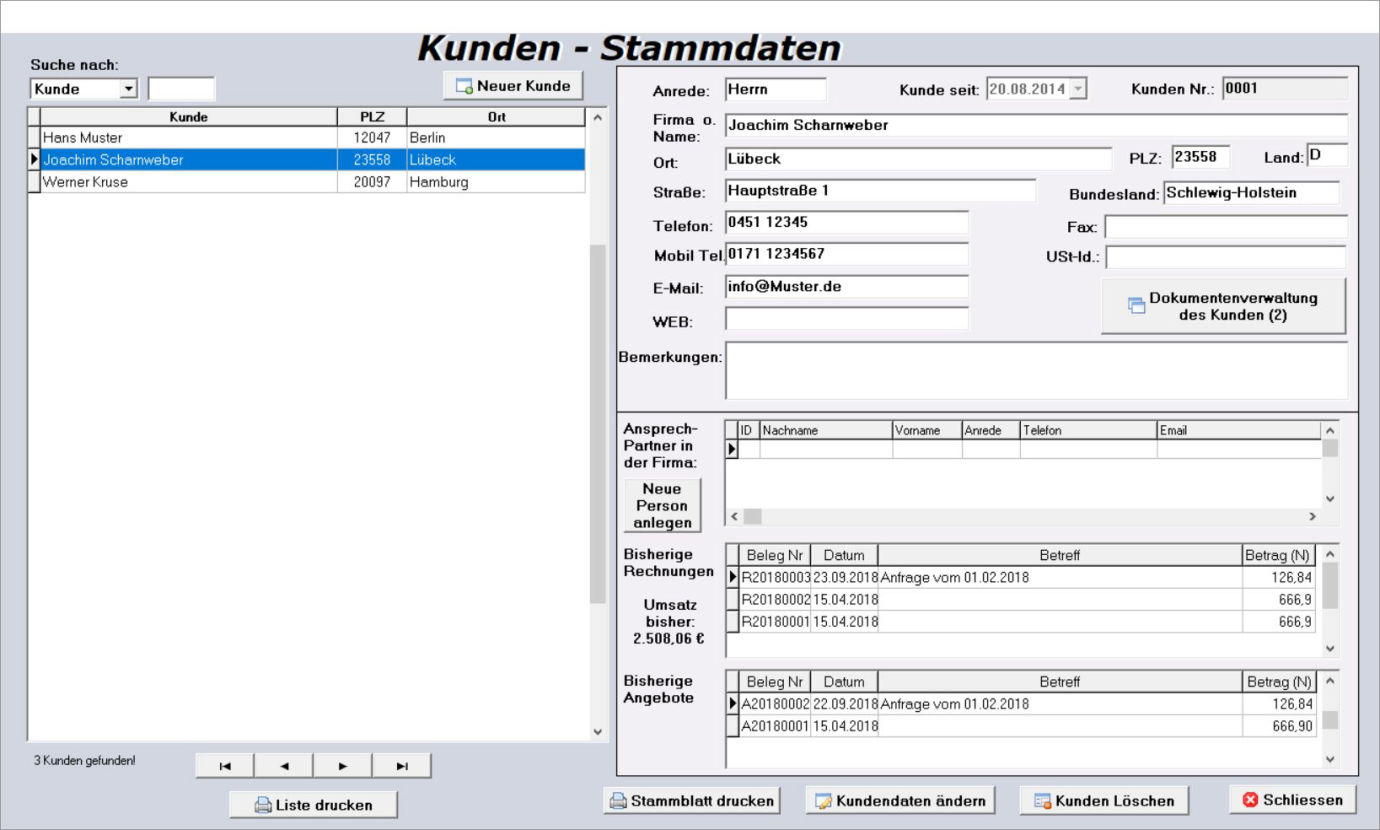Daten ändern, Listen und Stammblatt drucken sind ebenso möglich, wie das verwalten von Ansprechpartner bei Firmenkunden