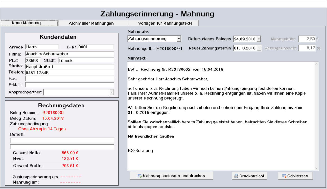 Alle Daten die für eine Mahnung benötigt werden, werden automatisch aus der Rechnung herausgezogen und inden vorbereiteten Mahnungstext übernommen.Zusätzlich kann in dem Text geschrieben werden wie in einem Worddokument.