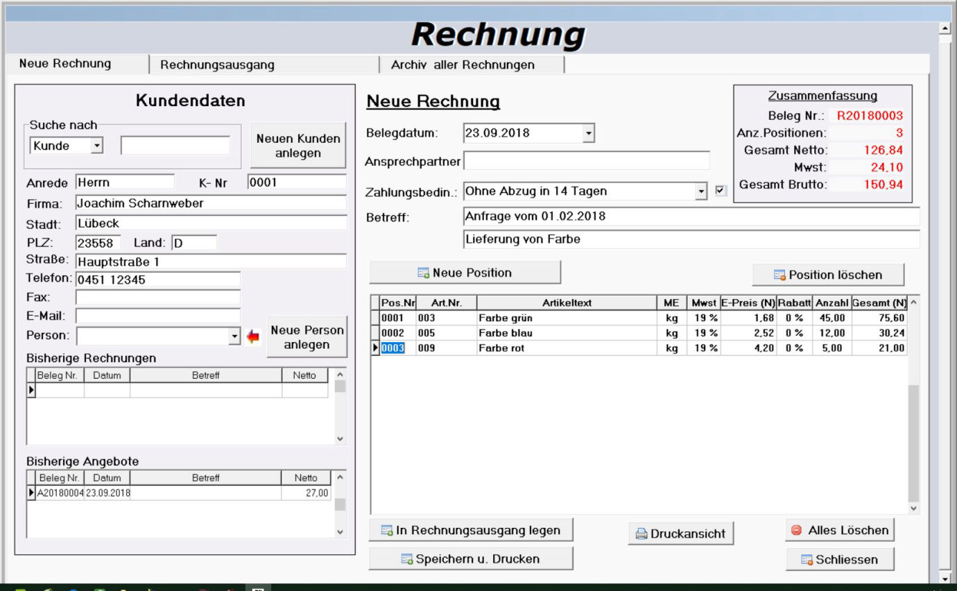 Zur Übersicht werden in der Zusammenfassung (rechts oben) die wichtigsten Daten der Rechnung angezeigt. Das ist sehr hilfreich bei langen Rechnungen.