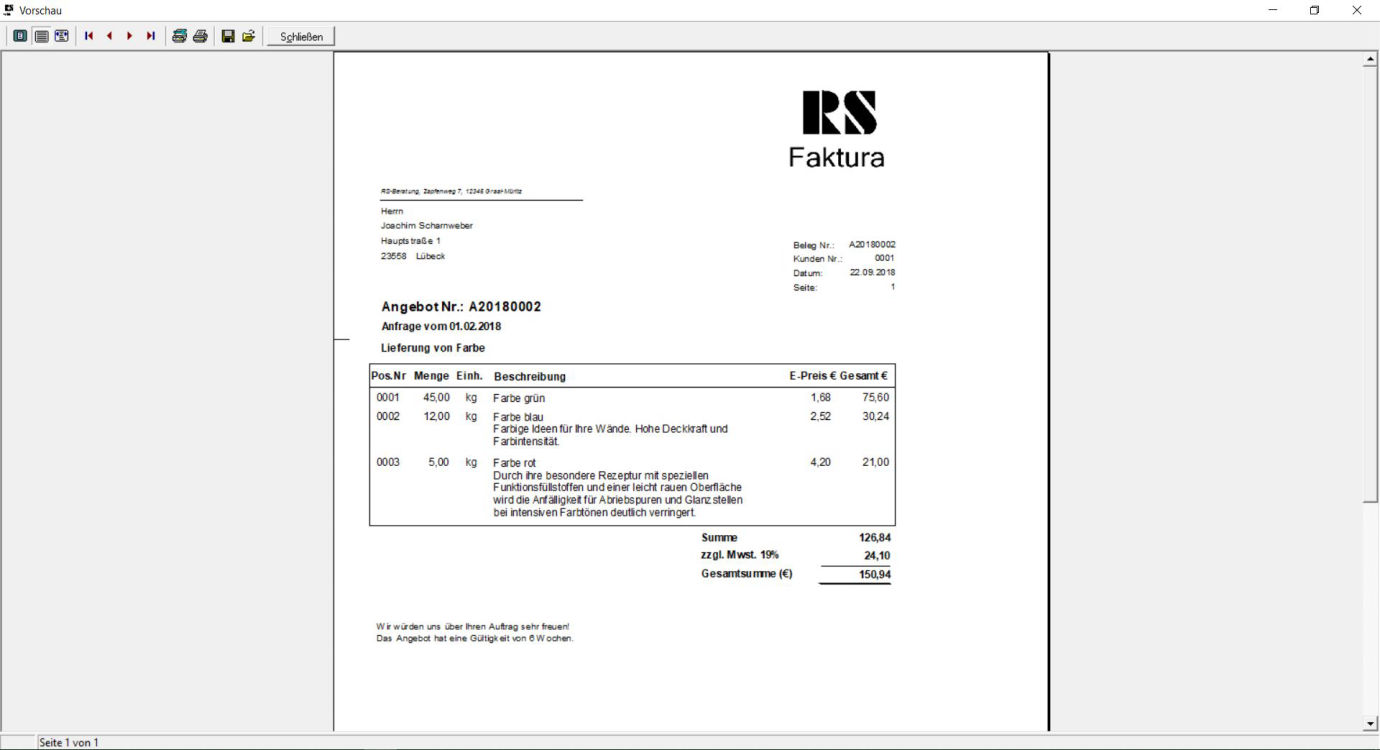 In der "Druckansicht" ist jederzeit ein Anschauen des gedruckten Angebotes möglich.Auch ist ein Probedruck möglich.