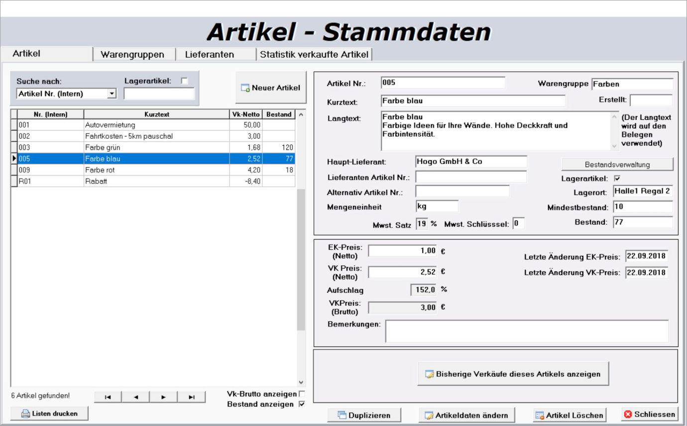 Neben den obligatorischen Daten für einen Artikel können hier auch Lieferanten und Warengruppen angelegt und verwaltet werden.