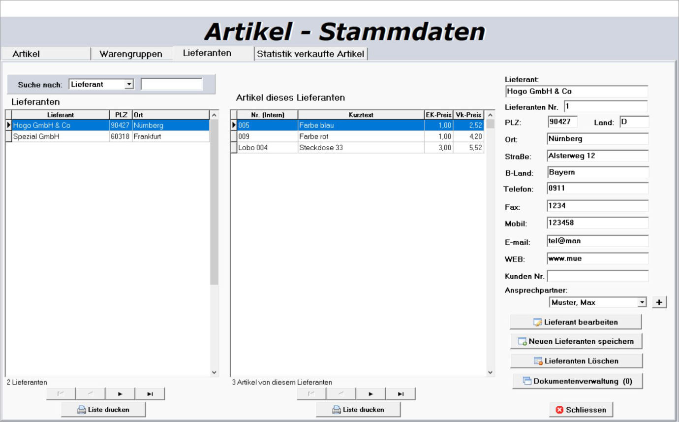 Lieferantenverwaltung mit Kontaktdaten und Zuordnung der bezogenen Artikel